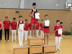 Am stärksten war die Altersklasse 10-11 Jahre vertreten. Hier starteten Jeffrey Moné, Luca Köper, Henri Förster und Phillip Greuel. In dieser Altersklasse wurde Jeffrey Moné seiner Favoritenrolle gerecht und siegte an allen vier Geräten mit deutlichem Vorsprung, so dass er auch in der Gesamtwertung den Regionalmeistertitel für sich beanspruchen konnte. Ebenso behaupteten sich unsere drei anderen Turner ihrem Leistungsvermögen entsprechend. Insbesondere hat Phillip Greuel sein Können bei seinem ersten Wettkampf souverän abrufen können. Leider konnte Jasper Claßen nicht an den Start, da er sich einen Armbruch zugezogen hatte. Er unterstützte aber seine Turnkameraden bei dem Wettkampf als Co-Betreuer nach Kräften.