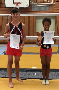Nachdem sich die Turner Jeffrey Mohné AK 11 und John Gülpen AK 12/13 bei den Regionalmeisterschaften für das Landesfinale qualifiziert hatten galt es am heutigen Samstag die volle Leistung vor der landesweiten Konkurrenz abzurufen. Die jeweils 10 besten Turner der anderen Verbände traten in den einzelnen Altersklassen an vier Geräten gegeneinander an. Jeffrey Mohné zeigte an allen Geräten beinahe fehlerfreie Übungen. Da die Kampfrichter auf dieser Ebene jedoch deutlich strengere Maßstäbe zur Differenzierung anlegen mussten und dadurch auch kleinste Fehler mit deutlichen Abzügen bestraft wurden, wurde die erreichte Platzierung bei der Siegerehrung mit Spannung erwartet. Jeffrey Mohné konnte sich mit etwas Abstand den ersten Platz gegen seine Konkurrenten sichern.