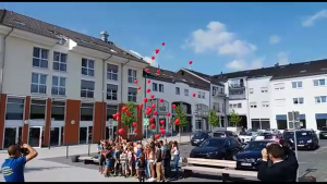 Mit roten, herzförmigen und mit Helium gefüllten Luftballons in der Hand zeigten Turnerinnen und Turner aus allen Altersklassen dem überraschten Hochzeitspaar gemeinsam eine von Ulrike Brandenburg auf das Lied „Marry You“ von Bruno Mars zusammengestellte Choreographie vor dem Simmerather Rathaus.
