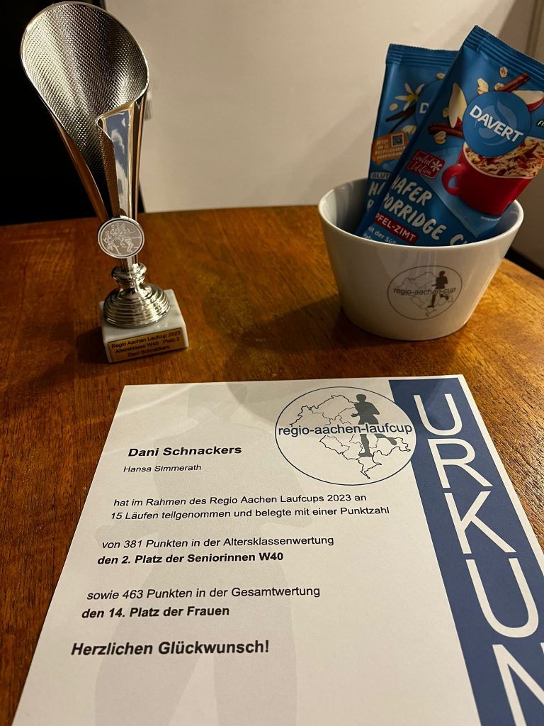 Wir gratulieren Dani Schnackers ganz herzlich zu ihrer erfolgreichen Saison im Regio- Aachen- Laufcup. Nach dem Lauf ist vor dem Lauf. Das Läuferjahr 2024 kann beginnen.